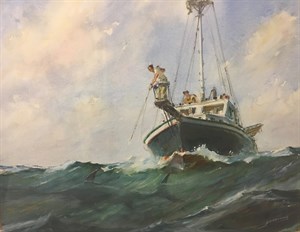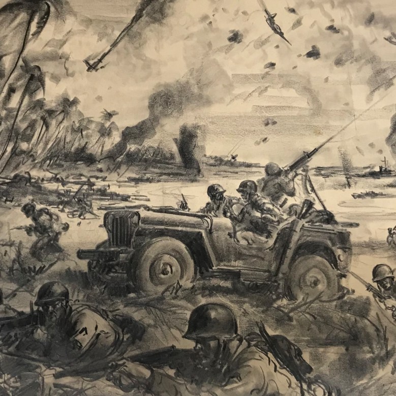 Including depictions of both WWI and WWII, these graphic artworks reveal the complicated, dangerous and chaotic environment of battle and the new technologies that were at play. His 1944 illustration of the U.S. Navy capture of the U505 submarine is held in the permanent collection of the Museum of Science and Industry, Chicago.